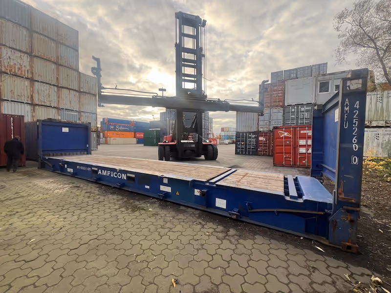 Robuster 40-Fuß Flat Rack Container für den Transport von überbreiter, überhoher oder besonders schwerer Ladung, die nicht in Standardcontainer passt. Die offene Bauweise mit klappbaren Stirnwänden ermöglicht seitliches und oberes Be- und Entladen per Kran oder Stapler. Ideal für Maschinen, Anlagen, Stahlkonstruktionen und Projektladungen im internationalen Verkehr. Stabile Stahlkonstruktion, ausgelegt für hohe Punkt- und Flächenlasten.