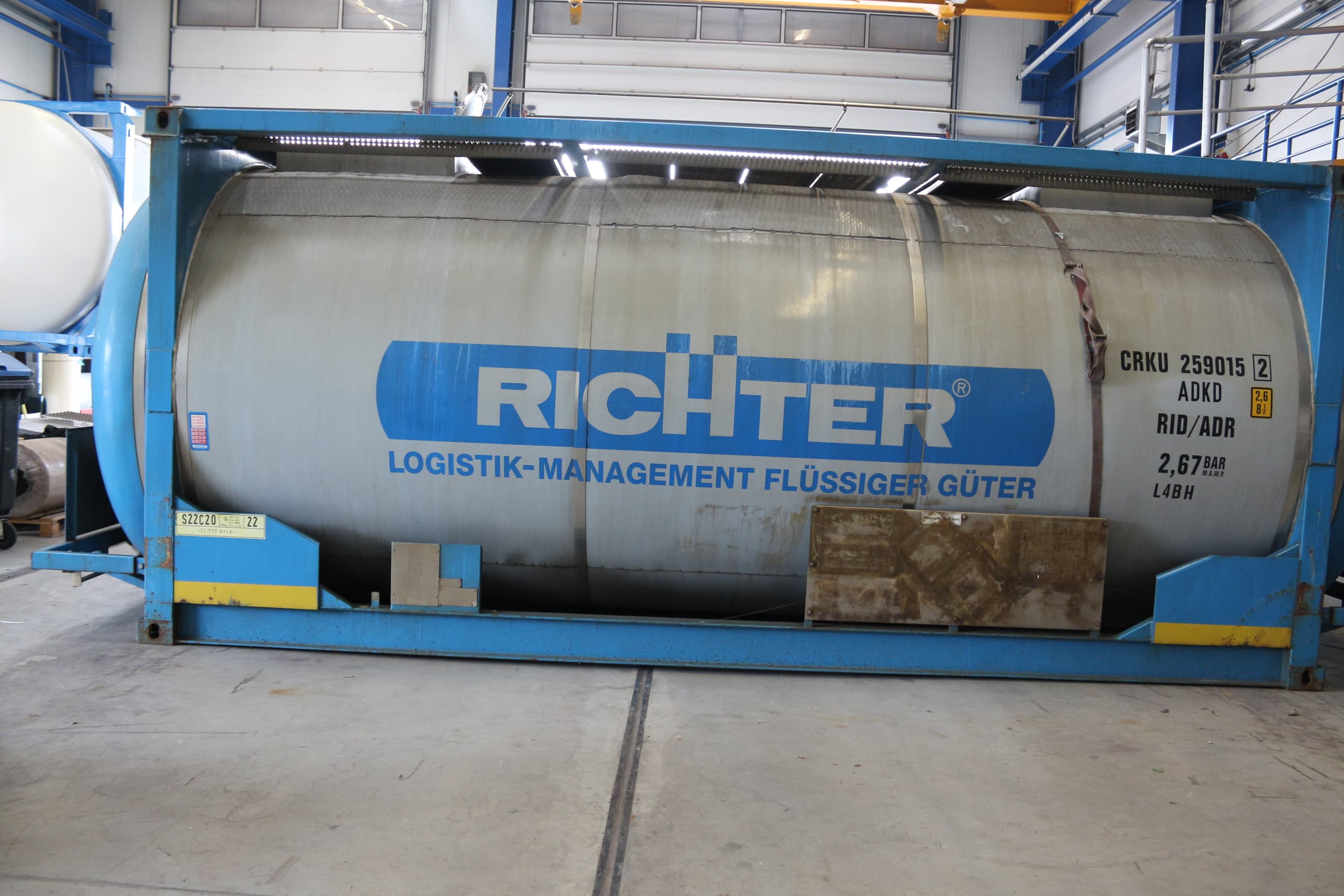 ISO-Tankcontainer für den sicheren Transport und die Lagerung von flüssigen Gütern, Chemikalien sowie Lebensmittelprodukten. Der zylindrische Edelstahltank ist in einen genormten Stahlrahmen eingebettet und für den intermodalen Einsatz auf Straße, Schiene und See ausgelegt. Je nach Ausführung geeignet für chemische Produkte (IMO) oder Foodgrade-Ladungen.